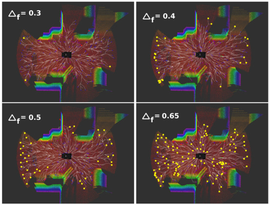 The maximum linear velocity that the vehicle can reach is 0.3 m/s, and the maximum angular velocity is 0.6 rad/s. The values of the exploration parameters that have been used can be consulted in Table 2. These parameters have been hand-tuned to the best performance achieved.