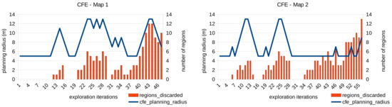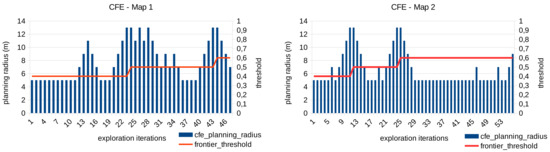 An example of the functioning of this module is presented in Figure 11. The planning radius around the robot and the frontier threshold are shown for each exploration iteration performed in the exploration maps 1 and 2 respectively. For the shake of clarity, we show only the results of the CFE approach with an initial frontier threshold of since the performance of the module does not depend on the frontier evaluator employed. As can be seen, the planning radius is adapted dynamically with the aim of finding frontier points. When the maximum radius is reached (13 m) and no frontiers are found, the frontier threshold is increased too.