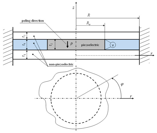 The analyzed converter is made up of four different materials arranged in three layers (Figure 1). The outer layers, of thicknesses t1 and t3, are made of non-piezoelectric material. One of these layers is the executive element of the transducer, while the other one can act as a protective layer/coating. The middle layer consists of two components (of the same thickness t2 = t4)—a piezoelectric disk and a ring made of non-piezoelectric material. In this case, the material of the ring is foam. Its task is to stabilize the electric wires supplying current to the electrodes of the piezoelectric disk. The inner radius of the ring is equal to the outer radius of the piezoelectric disk and is denoted as Ro. The outer radius of all layers is the same and equals R. All disks are fixed to and supported by outer cylindrical surfaces. The transducer deformation occurs because of the transverse piezoelectric effect (caused by the action of a V voltage) occurring inside the piezoelectric disk. In order to simplify the mathematical model, the following assumptions were made:
