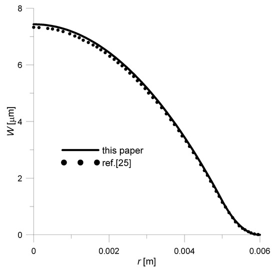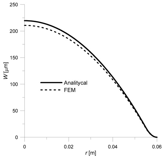 The obtained solution had to be compared to the ones available in the literature. Therefore, assuming—as the authors of the work did [25]—that the piezoelectric disk is made of Pz26, and the lower layer made of copper, a deflection curve was prepared (Figure 4). As for geometrical dimensions, they were respectively: R = 6 × 10−3 m, Ro = 5 × 10−3 m, t1 = 2 × 10−4 m, t2 = 1.5 × 10−4 m. In addition, the driving voltage was set to 200 V.