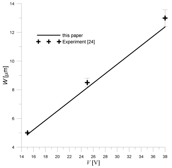 As there was no specific material data for Pz26 and Cu given by authors of paper [25], it was taken from [29]: E2 = 1/s11 = 7.69 × 1010 Pa, ν2 = −s12/s11 = 0.334, d31 = −1.3 × 10−10 m/V, E1 = 13 × 1010 Pa, ν1 = 0.34. Comparing the results obtained with the literature data (Figure 4), it can be concluded that both solutions are approximately equal—the maximum error is 1.3%. This slight difference in results could be due to the fact that comparative data (dashed line, Figure 4) was obtained by digitizing the graph from [25].
