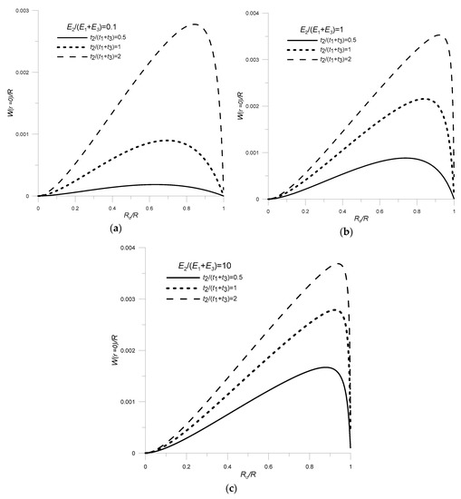 Influence of the ratio of elastic moduli, the relative thickness and the radius of piezo and non-piezoelectric materials on transducer deflection: (a) Eg = 0.1, (b) Eg = 1, (c) Eg = 10; ν1 = 0.34, ν3 = 0.46, R = 0.06 m, t3 = 0.0001 m, V = 100 V.