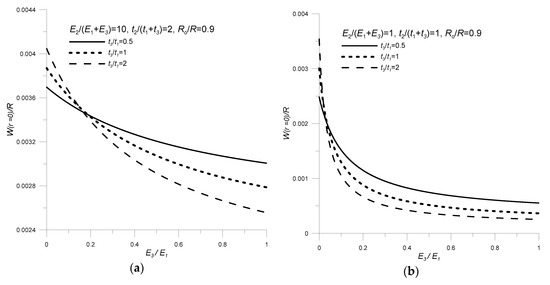 Influence of relative thickness and the ratio of elastic moduli of non-electrical materials on transducer deflection (a) Eg = 10, (b) Eg = 1; ν1 = 0.34, ν3 = 0.46, R = 0.06m, Ro/R = 0.9, V = 100 V.