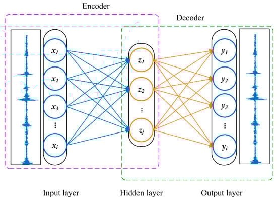 Autoencoder (AE) is a type of artificial neural network that is symmetric in terms of network structure. It is a very effective feature extraction method based on unsupervised learning. AE is composed of encoder and decoder, as shown in Figure 1. The encoder compresses the input data by nonlinear mapping, and the decoder reconstructs the input from the extracted features. After encoding and decoding, the output layer attempts to learn a set of vectors that are as close as possible but not identical to the input vector. At this point, the outputs of the hidden layer are the features that AE automatically extracts through unsupervised learning.