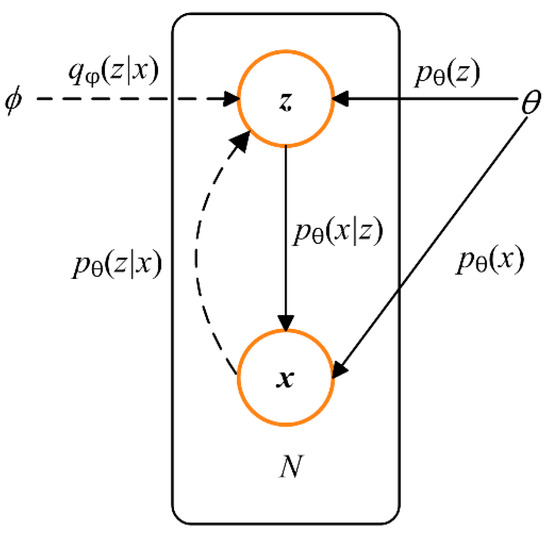 Variational autoencoder (VAE) has been widely applied in process monitoring and fault diagnosis [21,22,23] since it was firstly proposed in [24]. As shown in Figure 2, VAE generates x by sampling from the distribution of latent variable z. In Figure 2, pθ(z) is the prior probability of the latent variable z, which denotes the original distribution of z; pθ(x) is the distribution of the data set x that needs to be generated; and pθ(z|x) represents the posterior distribution of z, which is also called encoder. For the reason that pθ(z|x) is intractable to solve in practice, the variational approximation qφ(z|x) is often used to replace it.