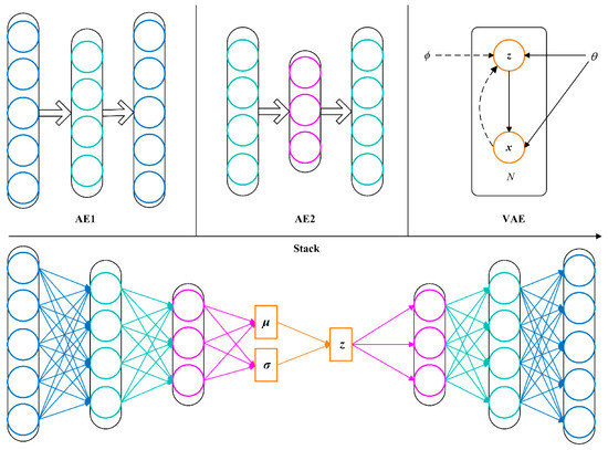 VSAE is a novel neural network by embedding VAE in SAE, which combines the merits of these two models. As shown in Figure 3, two AEs are pre-trained in succession, and then AE1, AE2, and VAE are stacked to form the VSAE model. Finally, fine-tuning of parameters is performed. In the VSAE, the features of input signals are extracted hierarchically by AE1 and AE2. Then, the distribution of latent feature space is modeled by a VAE network. Specifically, the standard deviation vector σ and mean vector μ of several Gaussian distributions are obtained with the help of two encoders, then samplings are performed from a standard Gaussian distribution , and the latent feature vector z is constructed by Equation (9), which indicates the process of reparameterization technique. Finally, after the decoders formed by multiple fully connected layers, the features are reconstructed into signals that are as equal as possible to the input signals. This VSAE model extracts the most essential features of the signal. In terms of mechanical vibration signals, satisfactory performance can be achieved even under varying operating conditions.