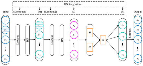The deep network structure of VSAE may introduce some flaws while improving the performance of feature extraction, such as the over-fitting problem and the “internal covariate shift” problem. Therefore, the dropout technique [27] and the batch normalization (BN) technique are introduced in this study to improve the generalization ability and convergence rate of the VSAE model. With the help of these techniques, the VSAE can converge quickly after fine-tuning, extract features hierarchically, and classify faults. However, there is still a concern that needs to be emphasized: some hyper-parameters in this model have a significant influence on the feature extraction effect, and inappropriate parameter values will degrade the performance of the VSAE model. On the other hand, fixed hyper-parameter settings are obviously not reasonable enough for different data sets. By introducing the HSO algorithm into the VSAE, the network structure can be adaptively adjusted according to different data sets, further improving the high-level feature extraction performance of the VSAE. The HSO–VSAE fault diagnosis model is shown in Figure 5.
