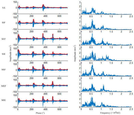 For the TBD234 diesel engine, one operating cycle consists of 720 degrees in angular domain no matter how the conditions change. For time domain signal, the length of each data file in each cycle is different under different operating conditions, which does not meet the needs of the model input. Therefore, the instantaneous speeds of engine are first obtained with the help of an eddy current sensor; then, the angular domain signals are obtained by resampling the time domain signal to the phase of 0~720° by linear interpolation. For each operating condition, the length of each data file is fixed at 3600. The envelopes are extracted in the time domain by the second order extremum method and then also resampled to the angular domain, as shown by the red lines in Figure 7. The frequency domain signals are obtained by a Fourier transform of the time domain signal. Figure 7 shows the angular domain signals, the frequency domain signals, and the envelopes in seven fault categories at 1500 rpm and 1300 N·m.