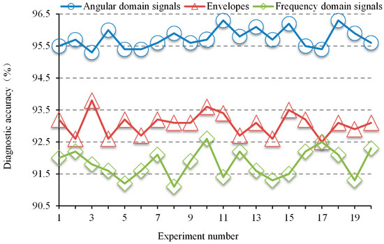 To study the effect of different input methods on classification accuracy, three groups of control experiments were set up. The first group took the angular domain signals as input, the second group took the frequency domain signals as input, and the third group took the envelopes as input. In these groups, 25% of the data set was used for the pre-training of VSAE model, another 25% was used for fine-tuning, and the rest 50% of the data was used for testing. The data set contained all 12 operating conditions. After adding the softmax layer, the network structure was 3600-512-256-20-10-64-7. In the pre-training, the iteration times of AE1, AE2, and VAE were 200, 100, and 50, respectively, the node discarding ratios Dropout1 and Dropout2 were both set to 0.1, and the number of iterations of fine-tuning SAE was 20 steps. In order to consider the influence of randomness, each group of experiments was repeated 20 times, and the diagnostic accuracy is shown in Figure 8. It can be seen from Figure 8 that when the angular domain signals were selected as the input, the diagnostic accuracy was 95.3~96.3%. When the frequency domain signals were selected as the input, the diagnostic accuracy was 91.1~92.5%. When the envelopes were selected as the input, the diagnostic accuracy was 92.5~93.8%. The results indicate that better diagnostic performance can be achieved with the angular domain signals as input. Representative input is very helpful for the feature extraction of each hidden layer. The larger the proportion of useful information in the input, the easier it is to retain the most effective principal component when extracting features hierarchically. Although the envelope can attenuate the effects of background noise in the vibration signals compared to the angular domain signals, the extraction of the envelope also leads to a loss of some key feature information, which is useful for fault diagnosis, such as frequency domain and time-frequency domain information. In the same way, the use of spectrum as input also results in the omission of information. The experimental results show that due to the limited cognition of the fault mechanism, pre-processing based on expert experience causes a certain degree of information loss to the input signals. In contrast, VSAE has obvious diagnostic advantages because it retains most information of the angular domain signals.