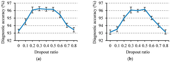 Diagnostic accuracy when the dropout parameters of the first two layers change: (a) the dropout ratio of the first layer Dropout1 and (b) the dropout ratio of the second layer Dropout2.