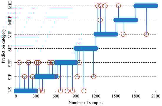 In order to further reflect the diagnostic effect of HSO–VSAE, a detailed analysis is carried out on the last test. In this test, there are 400 data files for each fault, and the total number of data files is 2800. The specific classification results are shown in Figure 11. It can be seen that there are four data files of NS that are misclassified, six data files of SIF are misclassified, four data files of SEF that are misclassified, four data files of SIE that are misclassified, four data files of MIF that are misclassified, two data files of MEF that are misclassified, and one data file of MIE that is misclassified. The overall accuracy rate reached 98.8%, indicating that the proposed HSO–VSAE method has a very satisfactory diagnostic effect on the valve clearance fault.