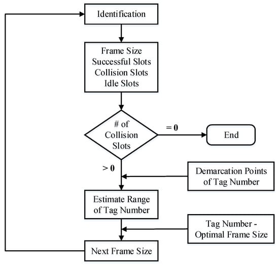 If the tag number is known, we can calculate the appropriate frame size to maximize access efficiency. Since frame sizes may not be continuous natural numbers, different tag numbers may correspond to the same optimal frame size. Therefore, even if the number of tags is unknown, if the approximate range of tag numbers can be estimated, the optimal frame size also can be determined. Figure 3 shows the process of tag identification.