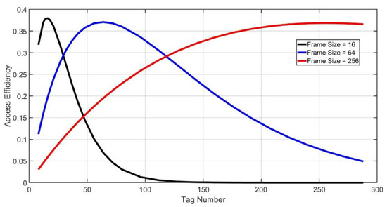 As shown in Figure 4, the maximum access efficiency will be realized if the frame size is equal to the tag number.