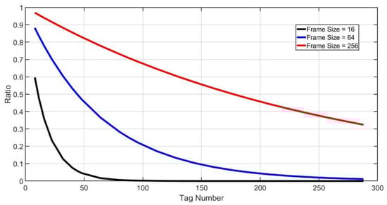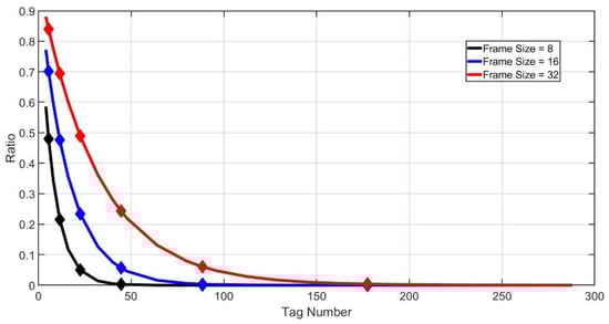 As we can see from Figure 6, when the frame size is much smaller than the tag number, the idle slot ratio curve descends rapidly. It may not be possible to accurately determine the range of tag numbers. For example, assume that the size of the last frame is 8 and . When , the next frame size will be according to our algorithm above. However, the actual tag number may be only 50. It will waste plenty of slots in this case. To solve the problem, we can analyze the border of successful, idle and collision slot ratios.