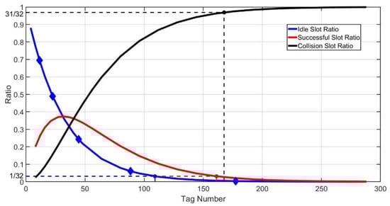 Figure 7 shows the ratios of idle, successful and collision slots when the frame size is 32. If the tag number is larger than , the probability of will be very high. is the solution of Equation (12).