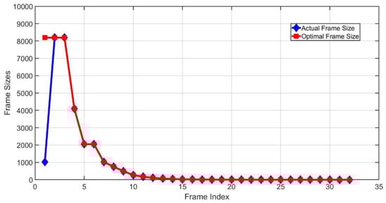 In Figure 8, the blue line represents the actual frame sizes of the LC-DFSA algorithm, while the red line shows the optimal frame sizes. The tag number is 10,000 and the initial frame size is set as 1024. In this case, 10,000 tags can be identified after 30 frames. According to the simulation results, after the second frame, the actual frame sizes are consistent with the optimal frame sizes, which shows the effectiveness of the LC-DFSA algorithm.