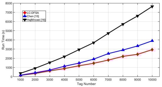 From the view of algorithm complexity, Chen, LC-DFSA and HajMirzaei only perform some fixed calculation and comparison, so the complexity of them are all . Besides, Figure 10 shows the simulation run time of each algorithm. To some extent, it can be proved that the LC-DFSA algorithm has the lowest complexity. Collision analysis by Manchester encoding increases the overhead of HajMirzaei, and Chen performs the examination in the middle of the frame, which will lead to more frames. Moreover, frame sizes of LC-DFSA are discrete while frame sizes of HajMirzaei can be any natural number. It also lowers the complexity of LC-DFSA.