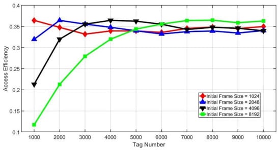 Figure 11 and Figure 12 show the effect of different initial frame sizes on the access efficiency. As we can see from Figure 11, the initial frame size has a great impact on efficiency. However, if the tag number is larger, then the influence of the initial frame size will be smaller. From Figure 12, it is found that when the initial frame size is small compared with the tag number, there will be stable access efficiency no matter how large the tag amount is. However, when the initial frame size is larger, the efficiency drops dramatically if the tag number is small. Besides, we can also find that there will be the maximum efficiency when the initial frame size is the same as the number of tags.