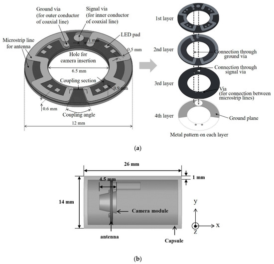 Generally, in capsule endoscopes, the antenna and camera have to be located on opposite sides of the capsule so as to prevent the antenna radiation from interfering with the camera recording. The proposed antenna offers a solution to this layout limitation by enabling the accommodation of both components on the same side. To this end, the structure of the proposed antenna has the following two features: a hole for camera insertion and a meandered line for securing LEDs. As shown in Figure 1a, the antenna substrate has a circular hole at the center, through which the capsule endoscope’s camera is inserted. After the assembly of all of the components, the camera is integrated at the center of the antenna facing outward. Owing to the camera hole, the antenna can be located on the same side as the camera, without obstructing the camera’s view. The microstrip lines on the first layer are meandered around the camera hole to effectively minimize the antenna size. Another advantage of the meandered line is that it provides space for the insertion of LEDs to illuminate the digestive tract during endoscope operation. The LEDs can be mounted in the empty spaces between the meandered lines. The metal pads for LED attachment are located next to the lines, as shown in Figure 1a.