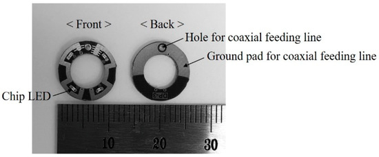 Figure 3 shows the fabricated antenna, constructed from a Teflon substrate with a dielectric constant of 2.17. The LEDs for illumination can be seen to be mounted on the front. The ground pad was provided on the back surface so as to connect the antenna ground to the ground of the coaxial line used to feed the antenna.