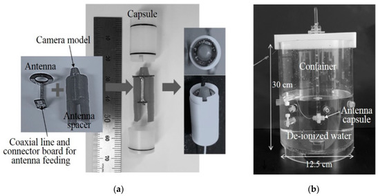 Measurement setup, namely: (a) antenna and camera model assembled within capsule; (b) capsule antenna inside tissue-simulating liquid.