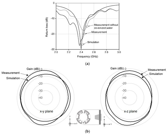 Figure 5a also shows the return loss measured after removing the de-ionized water from the container. The center frequency increased slightly, but the return loss remained low at 2.4 GHz. This means that the return loss does not affect the antenna gain, even when measured in free space. The antenna gain was measured in a full anechoic chamber. Figure 5b shows the antenna gain measured in free space at 2.4 GHz and the simulated gain. The measured average and maximum gains at 2.4 GHz were −4.9 and −1.3 dBi, respectively, on the x-y plane. The measured average gains showed small variations (of less than 3 dB) between 2.3 and 2.5 GHz. The measured gain in Figure 5b shows that the variation due to the elevation angle is less than 10 dBi; thus, the fabricated antenna is close to being isotropic. The gain was also simulated and measured on the perpendicular plane (i.e., the x-z plane), with no significant differences observed. This is because the antenna has meandered transmission lines on a circular substrate, and such symmetrical line distribution enables near-omnidirectional radiation patterns.