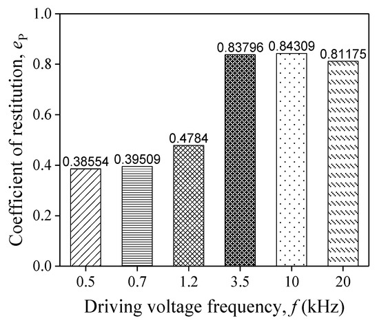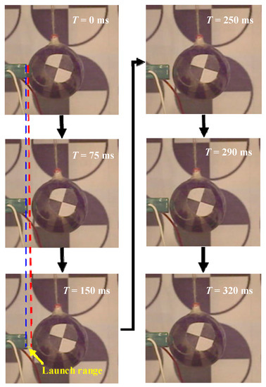 Figure 3 shows one driving progress of the object taken by high-speed camera. To demonstrate the bouncing phenomenon clearly in the image, the Lr we chose in Figure 3 was much larger than that which resulted from the first contact driving. With the high-speed camera taking 2000 pictures per second and 640 × 480 pixels for each picture, the driving process is recorded. The position of the object can be illustrated by the pixels’ position of its center pixel. In Figure 3, the distance between two pixels is 1.52 mm. The displacement of the object can be calculated by the number of the pixels that the center of the speckle paper crosses.