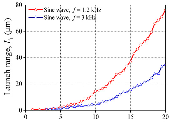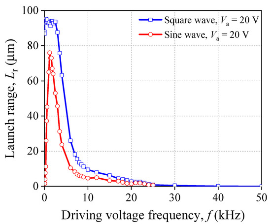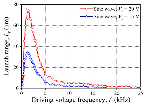 In order to detect the influence of f on Lr, the driving voltage as sine wave and its amplitude are maintained. As shown in Figure 5, Lr increases as f increases before 1.2 kHz. On the contrary, Lr decreases with the increasing of f when f > 1.2 kHz; but the decrease rate is less than the increase rate. Eventually, Lr drops down and approaches 0 μm when f > 2.0 kHz. In addition, the peak value of the curve is 76 μm and 34.2 μm for the case of 20 V and 15 V, respectively.