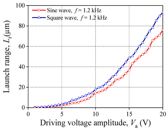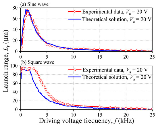 Figure 12 gives the theoretical solution of launch range Lr under different driving voltages. It shows that the curves of computational solution have a good agreement with that of experimental data. The maximum of Lr of the experimental data and the theoretical solution are almost the same. In addition, both curves have the same tendency with the increase of f. For the sine waveform, the largest Lr of the theoretical solution is 77.5 μm at 1 kHz while the experimental one is 76 μm at 1.2 kHz. For the square waveform, the largest Lr of the theoretical solution is 95.5 μm while the experimental one is 95.2 μm. The potential waveform distortion may cause the horizontal segment of the experimental curve to be longer than that of theoretical curve. Table 4 lists some data of Lr calculated by proposed theoretical method for different amplitude of voltage Va, sine wave. It shows that the theoretical solutions are also good enough for the different Va.