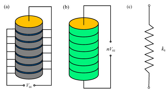 Then, we can regard the model as a liner spring with its stiffness being (see Figure 9c). Finally, the piezoelectric force is simplified as:
