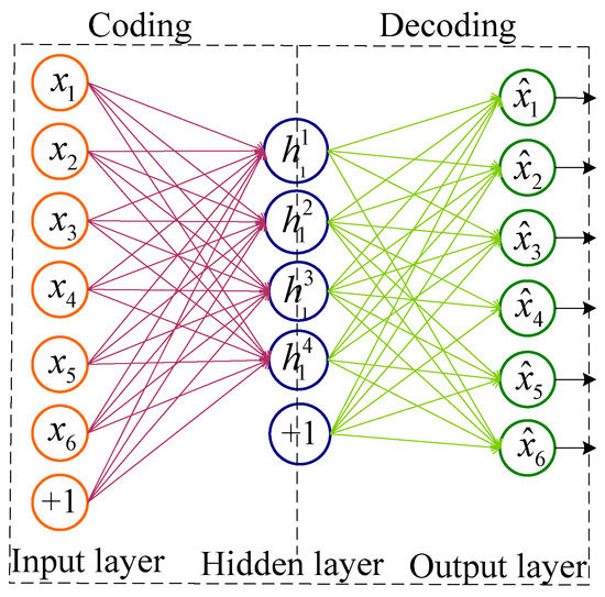 - Decoding phase: the information is transmitted from the back to the front:where is the output value of the decoding layer, and are the weights and bias of the decoding layer, respectively, and .