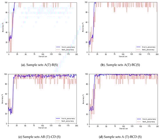Figure 4a–d are graphs showing the state recognition accuracy of test data (target data) and training data (source data) under four working conditions, respectively. The trend of the accuracy of training data (source data) and test data (target data) is synchronized. Therefore, there is no over-fitting. In the case of single/single conditions A (T)-B (S), the state recognition accuracy of the test data almost reaches 100%. In the case of single/multiple conditions A (T)-BC(S) and A (T)-BCD(S), the state recognition accuracy of the test data is 98.50% and 96.86%, respectively. In the case of multiple/multiple conditions AB (T)-CD (S), the state recognition accuracy of the test data reaches almost 90.50%. The experimental results show that the MBDA-SAE method can obtain higher state recognition accuracy under variable working conditions.