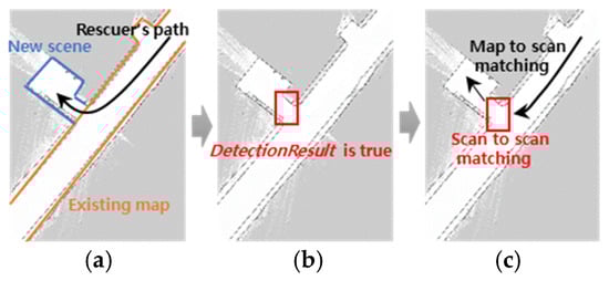 Advanced TSD-SLAM process: (a) gathering a significantly different new scene; (b) detecting the matching failure point; (c) scan-to-scan matching is performed instead of map-to-scan matching at the point.