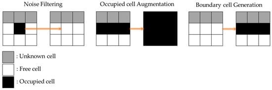 To enhance the occupancy map quality, a low-pass filter is applied to the map as shown in Figure 2. Noise can arise owing to the small occupied cells surrounded by the large free cells or vice versa. The cells, which are called the noise, are reclassified via a simple majority vote of the nearest neighbors of each cell. Additionally, to complement the result of the map transform, the occupied cells are augmented and all the boundary cells between the unknown cells and the free cells are assigned to the occupied cells.