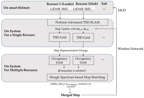 Figure 3 presents the proposed rescue scheme. LiDAR and IMU data for all the rescuers including a lead rescuer are measured using their smart helmets. Using the data, the advanced TSD-SLAM is performed, which estimates the rescuer’s current position and produces a map by updating the TSD grids. At a suitable time to match and merge the maps, the occupancy grid maps are generated using the TSD grid maps. The Hough and x-y spectra are generated on the occupancy grid maps and a transformation matrix is produced by determining the local maxima of the spectra cross-correlation. The transformation matrix applies to the individual TSD grid map update, in addition to the occupancy grid map merging process. In the merging process, the map of the leader rescuer is matched and merged with the others one by one. The total map merged from the individual occupancy grid maps is transferred through the wireless network to all the rescuers. Finally, all the rescuers can view the total map in their head-up displays (HUDs). This can help them search for the victims more efficiently.