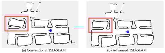 Comparison of the conventional TSD-SLAM and the advanced TSD-SLAM. The left part of the map was not built accurately in (a), but the matching errors were reduced in (b).