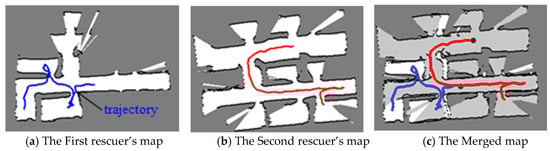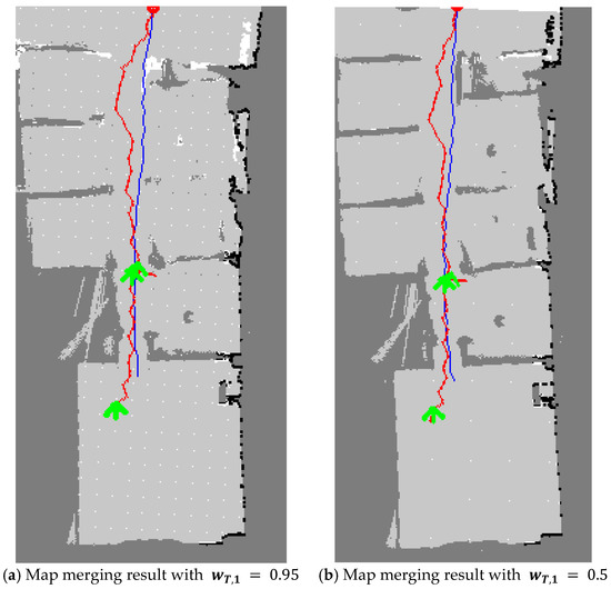 Figure 13 shows the comparison results. The quality of the merged map with the TSD grid update using a large weight , was low, indicating that it is tedious to reduce the errors that occur in the SLAM. This is because one rescuer’s TSD grid map rarely affects the other rescuer’s TSD grid map, as shown in Figure 13a. In contrast, if the maps are merged using the TSD grid update process with a weight equal to the other weight , a more accurate map can be obtained, as shown in Figure 13b. As indicated by the figures, the errors that occurred in the SLAM were significantly reduced. Thus, an individual SLAM can be enhanced using the results of accurate map merging.