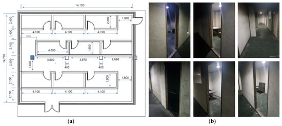 Test indoor environment: (a) top view of the environment; (b) all the rooms and corridors were basic in design).
