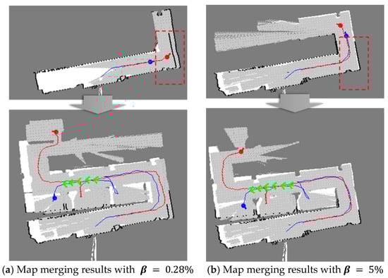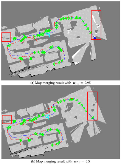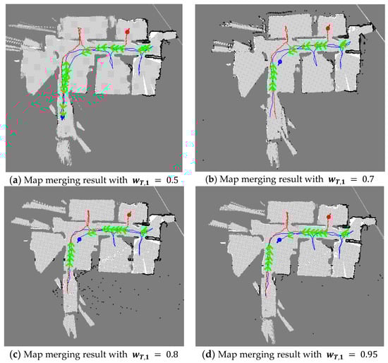 Figure 16 shows the comparative results where the shape of the rooms can be recognized in the map merging result. However, in some areas, the rooms and the corridors were not separated. Additionally, errors due to the matching or the update were observed. As shown in Figure 16b,c, there were matching errors, which were not removed until the end of the experiment. However, in Figure 16d, all the rooms can be easily recognized and clearly separated. This indicates that if there are errors in map matching, it is more beneficial to update the merged map with a larger weight than to use a weight equal to the other weight .