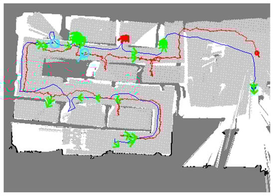 Figure 9 shows the result of the first method. The blue and red lines represent the trajectories of rescuers 1 and 2, respectively. The green arrows represent the UWB results, and the cyan arrows represent the results for the detection of humans and victims in the room. The first method, however, did not update the individual TSD grids even after the occupancy grid maps were merged. In the merged map, it was evident that the two occupancy grid maps are different in terms of the free cells represented by the white and light grey colors and it was difficult to understand the whole map correctly.