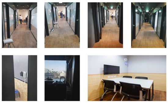 The third experiment was conducted in a public indoor environment with many meeting rooms, as shown in Figure 11. In contrast to the second environment, it consisted of glass doors and windows, which may cause errors in the SLAM. First, the performance of the advanced TSD-SLAM was compared with that of the conventional one, as shown in Figure 12. In particular, the left part of the map was built accurately as shown in Figure 12b, whereas the conventional TSD-SLAM accumulated orientation errors over time. The difference between results of the conventional and advanced TSD-SLAM methods was clearly observed in the environment with many rooms.