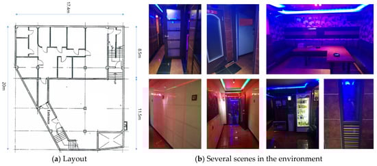 In the fourth experiment, a karaoke venue called Noraebang in Korea was tested, as shown in Figure 14. It consisted of several rooms with glass doors and different floor-to-ceiling heights, which could induce errors in the SLAM. Figure 14a shows the blueprint of the experimental environment; it was approximately 18 m × 18 m in size. The performance of the advanced TSD-SLAM is shown in Figure 15. In the conventional TSD-SLAM, (Figure 15a) there were orientation errors, particularly, in the area marked by the red box. However, the orientation was estimated correctly in Figure 15b even though the rescuers frequently opened and closed doors to search for victims.