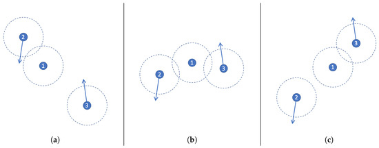 Example of a mobile scenario that involves three nodes, (a) First position, where nodes 1 and 2 can communicate, (b) Next position, where the 3 nodes can communicate, (c) Last position of nodes, where nodes 1 and 3 can communicate.