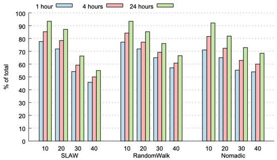 The experiments were performed during 24 h. Then, we split this historical data in 6 fragments of 4 h each, and also in 24 fragments of 1 h each. The results of every individual fragment were analysed and the average values of every fragment was computed. Figure 3 plots the predictability limit (percentage of TC messages that have already appeared in the past) for the three considered HDWS (i.e., 1, 4 and 24 h), with three different mobility models for the nodes (i.e., self-similar least action walk (SLAW), RandomWalk and Nomadic), and for 10 to 40 nodes participating in the network. The predictability limits range from 50% to more than 90%, with very low variance (average variance: 0.024% and maximum variance: 0.108%). As expected, the predictability limit increases with a larger HDWS; particularly, a HDWS of 24 h achieves the highest predictability limit, and a HDWS of 1 h presents the lowest values. These results can be explained, because in a 24 h time-period, there is a higher opportunity to find TP messages that have already appeared in the past.