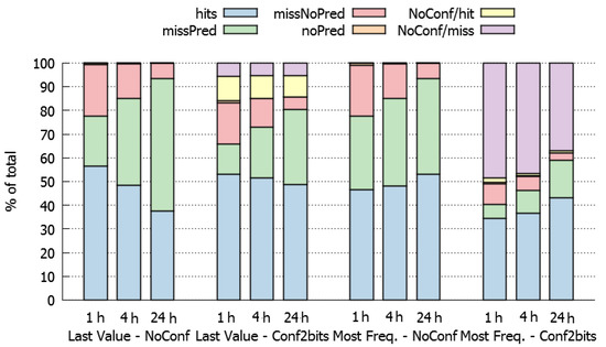 Concerning the use a confidence method to support the predictions, the aim is to reduce the number of bad predictions (misses) due to low confidence. The results show (second and fourth quarter in Figure 4) that the percentage of hits tends to decrease in these cases. The predictions that are not performed due to lack of confidence and would be misses (purple values in Figure 4), and are much larger for the most-frequent than for the last-value approach. The use of confidence jointly with the last-value approach is counterproductive, because most predictions that are not performed would have been hits (yellow values in Figure 4).