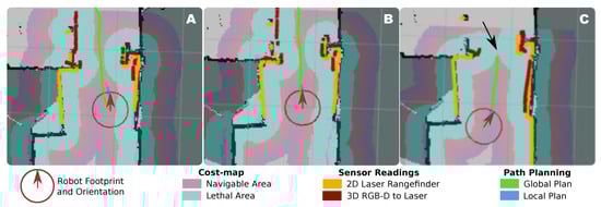 To illustrate this, Figure 1 shows the problem of autonomous navigation of a mobile robot when passing through a narrow area. This figure presents the cost-map [15] built by the robot and the sensor readings when facing this navigation task. In short, a cost-map represents the cost of traversing each position in the map according to certain criteria, which, in this case, is the distance to the detected obstacles. Specifically, we illustrate the scenario where a mobile robot (with a circular footprint of 52 cm ø) is commanded to pass through a standard-sized door (72 cm wide) connecting two rooms. Three different situations are displayed in this example: (A) the desired scenario, where the robot is facing the door from a close initial position and almost following a straight path, (B) a more challenging situation where the combination of the sensors’ noise, the calibration errors between the sensors (i.e., the 2D laser scanner and a 3D RGB-D camera, in the example), and the error in the robot localization reduce the navigable area in the door frame, yet, being feasible the estimation of a path, and (C) an illustration of a faulty navigation attempt where the robot perceives there is not space to pass through the door and, therefore, will abort the navigation. The critical issue is, in all cases, the relatively small margin of operation for the robot to plan and execute the navigation. Theoretically, the robot in our example has a margin of ∼20 cm to pass through the door but, as can be seen in the corresponding cost-maps, the robot sensors do not perceive such a clearance but a much more restricted one of just a few centimeters. This, in practice, causes the robot to fail its navigation on many occasions, limiting the accessibility to other rooms and spaces in the house and, consequently, its practical value as an assistant. It must be stressed that in this figure only errors related to noise, calibration and localization can be represented, yet, we still need to account for the inaccuracies of the reactive navigator when following the global plan, and the motion execution errors that may also affect the navigation result.