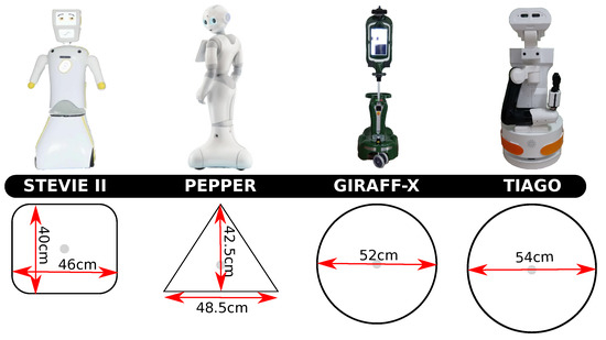 Pictures of the four robots considered in the experimental section together with their respective footprints. The robots have been ordered according to the dimensions of their footprints from left (smallest) to right (biggest).