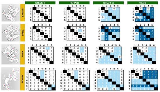 Navigation results for the different robots and test environments. The results are labeled as 0: no CNP detected, navigation without error, 1: one or multiple CNPs detected, navigation successful only after considering the ANPs, or 2: one or multiple CNPs detected but navigation failed even after considering the ANPs.