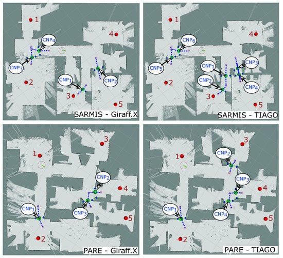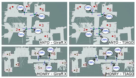 Figure 7. Illustration of how different robot shapes lead to the detection of different CNPs in the environment. Nodes are displayed as red dots and numbered according to the order used in the experiments, CNPs have been explicitly marked and numbered according to the order they are created during the experiments, and ANPs are marked with a blue-dash line that joins the two ANP belonging to the same CNP.Interestingly, the typical distribution of rooms in a house promotes paths that heavily turn on the doorsteps and corners to reach the different destinations, becoming, therefore, challenging for big sized robots. These scenarios represent the core of our proposal, producing ANPs to enforce the robot to turn in place and traverse the CNPs following paths as straight as possible, hence solving most of the problematic navigations. - Regarding the automatic detection and characterization of the critical points in the environment, our proposal has demonstrated to be robust and versatile, successfully locating the set of CNPs and ANPs in most situations (see Figure 7). Yet, like any other algorithm, it is not exempt from failures, being advisable the supervision of a technician to ensure maximum coverage of the navigation area within the house during the robot deployment phase, especially with large robots and/or small environments. In any case, our navigation assistant provides a suitable initial proposal of critical zones that, if needed, can be further fine-tuned by a technician or a robotic practitioner.