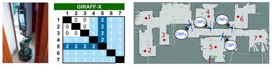 The results of this experiment are detailed in Figure 8. As can be seen from the node-to-node navigation table, the success rate is, as expected, a bit worse than in simulation (refer to the table in row 4 and column 3 in Figure 6). This difference appears mainly due to the slight dissimilarities between the real conditions that might affect the navigation and the simulation of the scenario, leading to worse results in terms of navigation for the real experiment in comparison to its simulated counterpart. In this case, the navigation capability of the Giraff.X robot in this challenging environment degraded to a poor when operating unassisted. Nevertheless, our proposed navigation assistant significantly improves its performance, rising the NSR up to . With respect to the detection of the CNPs, the main differences with the simulation case are (i) the creation of an additional CNP (CNP in Figure 8 (right)), and (ii) the failure to navigate to/from node 5 even after the consideration of the CNP and its associated ANPs. The former corresponds to the narrow corner at the edge of the corridor connecting nodes 1–3 with 4–7, which, in some occasions, made the robot to get stuck, so an additional CNP had to be automatically created to solve this issue. The latter is related to the location of the ANP close to node 5. Given that the ANPs are set according to the location of minimum cost (see Section 3.2), in practice, the presence of a shelf at one side of the door entrance makes the ANP to be moved too far from the perpendicular line to the CNP, leading the robot to graze the door-frame or even to get stuck when trying to cross it. This is the type of situation that would require a fine-tuning of the ANPs position by a human supervisor. A video of the real robot operating with our navigation assistant can be seen in http://mapir.isa.uma.es/work/paper-awg.